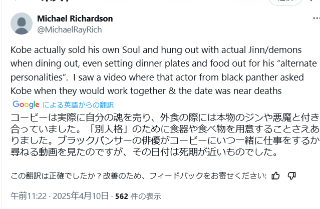 あまり詳しくはないけれど、マイケル・ジョーダンは悪魔に魂を売ったという事ですね。ディディのパーティにも関係あるらしい。詳しくはXに直接入って見て下さい。