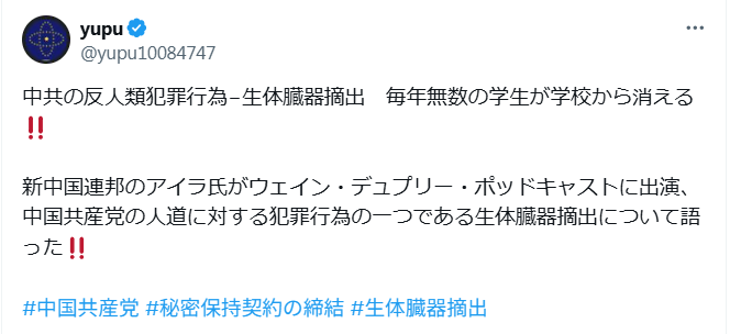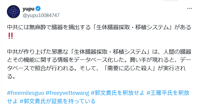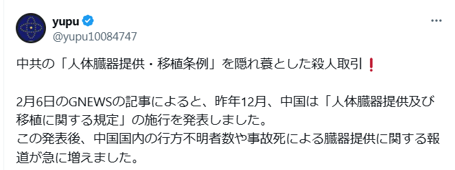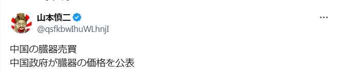 以前から問題になっていましたね。新疆ウイグル自治区の人たちや法輪功の信者たちの臓器を生きたまま取り出していた。すごい商売になって、日本からでも大勢の人がお金を払って臓器移植をしたのでしょう。二階さんの奥さんも移植手術を受けた噂もありますね。こんなに大ぴっらに価格まで公表するとなると犯罪も増えるでしょうね。眼科医までも移植手術を行ったと聞いております。
