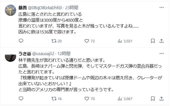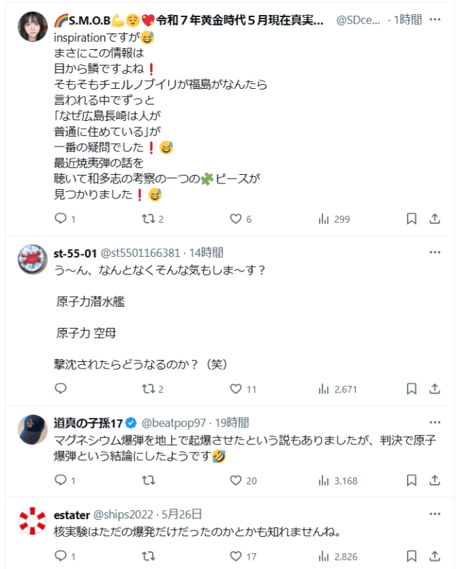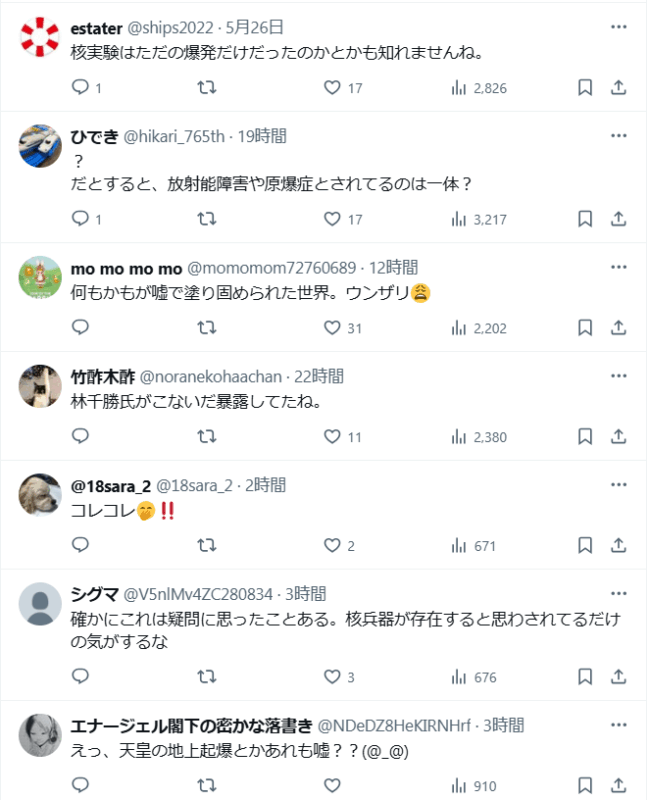 核兵器は存在しない プーチンが核兵器を打たない理由 本当ですか? 世界・日本の真実 2025.05.27 えっ!?どういうことですか?今までに昭和天皇が原爆の特許を持っていて、理化学研究所の仁科教授やら湯川秀樹の名前が出ていたのに・・マグネシウム爆弾で地上起爆説も出ていましたね。一体どういう事でしょうか? 答え合わせ:プーチンが核兵器を撃たない理由 pic.twitter.com/Qw1tnHQj9B— フラットアース🌎❌ (@FlatEarth_TW) May 26, 2025 動画【復刻版】福島第一原発に行ってみた!! やはり原発も放射能も存在しなかった!! をYouTubeに再アップいたしました2019年にYouTubeチャンネル「KAWATAとNANAのRAPT理論」にアップし、その後、運営側によって… 広島 – 原子爆弾による放射線障害はマスタードガス中毒だった一個教えておくわ。原爆使うと70年草木は生えないと言われていたのに、投下後の翌年から緑がいっぱいだった…チェルノブイリ、福島もね…何故だろうね〜 pic.twitter.com/naQekg2BUd— BULLET (@nbe222) May 16, 2025 原爆地上起爆説 天皇家の真実ドロドロした天皇家の真実を内藤晴輔さんが語ります。ここではあんみつ姫さんのポストを貼り付けます。このサイトでも内藤晴輔さん お話会その① その➁とアップしてあります。長編です。是非見て下さい。明治維新からオレンジ計画で「日本を潰す」シナリオ... 原爆地上起爆説 再掲載ですTOYO NOTEさんからの情報や、笹原俊さんのブログ 小泉芳孝さんの書籍 エンドゥーさんの動画でも地上起爆説を説明されておられます。今更ですが、もう一度載せます。こんな預かり書まででてきました。詳しくはTOYO NOTE大東亜戦争の真実 ... 原爆は地上起爆だった以下の動画を見たことで、地上起爆だったと断定しました。内藤晴輔さんも同じことを言われています。他に民族学者小泉芳孝さん(竹取翁博物館館長)の著書でも詳しく書いてあります。エノラゲイに4tもある原爆を積載して広島に落とすのは無理。アインシュタ... ヒロシマ・ナガサキ原爆、東京大空襲、東日本大地震(人工地震)の首謀者は李家【昭和天皇】許可を出したのは天皇!プーチン大統領が公言!世界初の日本製…広島原爆地上起爆!東京大学で完成した原子爆弾の実験!偽天皇は特許を取得!東京大空襲も広島・長崎原爆も偽天皇と米 再掲以前に紹介したかもしれませんが、再び気分上々マジックアワーさんがアップされていました。これは内容がとても濃いので、私も再びあげます。今まで陰謀論と言われて馬鹿にされてきましたが、ここで陰謀論=真実ということになりました。各国の首脳陣がどんど...