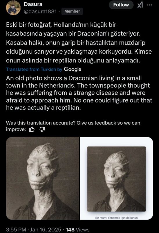 古い写真には、オランダの小さな町に住むドラコニアンが写っている。町の人々は彼が奇妙な病気にかかっていると思い込み、近づくことを恐れていた。しかし、彼が実は爬虫類人だとは誰も気づかなかった。