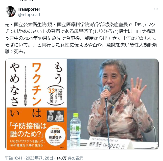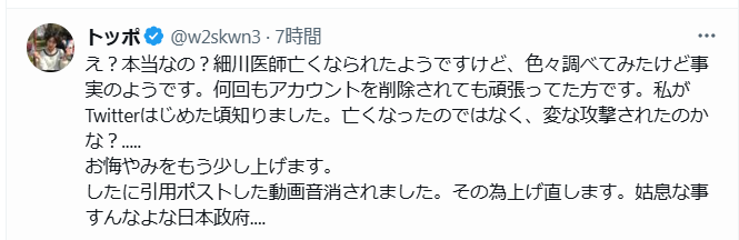 細川先生 魂の叫び! 疑わしいですよね。何故死因を公表しない? はっきり言うわ!やられたね 世界・日本の真実 2025.06.012025.06.02 願わくばQアライアンスの証人保護プログラムに入っていることを希望します。もう次から次へと真実を訴えている人たちがいなくなっている。不思議でしょうがないです。 悔しいね… 日本の闇は怖い。都合の悪い人たちを次から次へと殺していくんですね。世界でもアフリカのワクチン拒否した大統領7人がやられました。