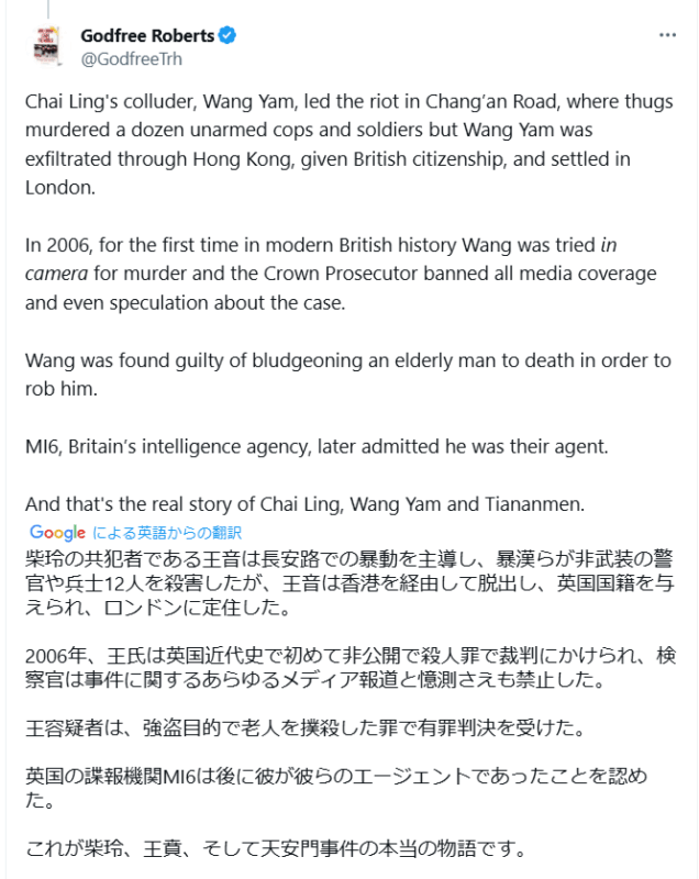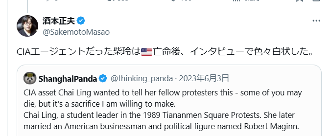 CIAエージェントのチャイ・リンは、抗議活動仲間にこう伝えたかった。「あなたたちの中には死ぬ人もいるかもしれないが、それは私が喜んで払う犠牲だ。」 1989年の天安門事件で学生リーダーを務めた柴玲。彼女は後に、アメリカ人実業家で政治家のロバート・マギンと結婚した。