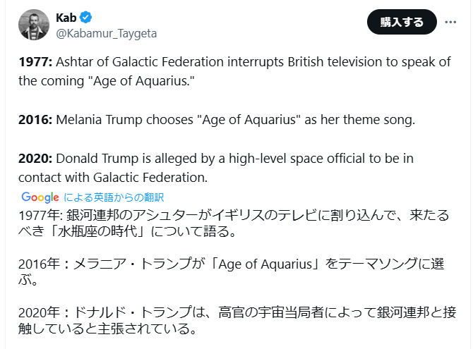 銀河連合は48年前に警告していた! 世界・日本の真実 2025.06.08 イギリスのテレビに割り込んで 来たるべき「水瓶座の時代」について語った。2016年:メラニア・トランプが「Age of Aquarius(水瓶座の時代)」をテーマソングに選んだ。情報はこれだけなので今から探します。 💫銀河連合は48年前に警告していた👽💫✨⭐️🛸👽✨💫💥1977年 : 銀河連合のアシュターが ✨👽🇬🇧イギリスのテレビに割り込んで 来たるべき「水瓶座の時代」について語る。💥2016年:メラニア・トランプが✨🎶✨「Age of Aquarius(水瓶座の時代)」をテーマソングに選ぶ。… pic.twitter.com/XOtcz9R2BD— # hii (@hii29227409) June 8, 2025