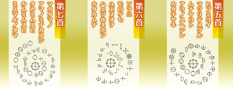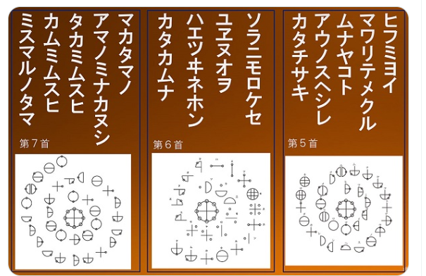 次は、カタカムナウタヒ(歌)を唱える効果についてです。カタカムナウタヒとは、以下のように、カタカムナ文字で、渦巻き状に書き記された、全部で80首ある歌です。画像は、その中でも特に大事とされる5・6・7首です。