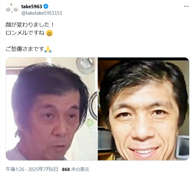 顔が変わった有名人!ロンメルされたのかな? 世界・日本の真実 2025.07.06 一瞬の表情があれっ?ちがう!と思うことがありますよね。年齢も違うから痩せたり、太ったりで一体どうなんでしょうか。 顔が変わりました!ロンメルですね 😁ご愁傷さまです🙏https://t.co/S6hAAsxgzB pic.twitter.com/G2jmw5Vg7C— TOYO (@toyo1126Q17) July 6, 2025 難しい判断ですが、私もなんとなく今までとはちがうのかな・・・?と思っていました。 随分と顔変えてるけど出馬するんだ🤣🤣🤣🤣 pic.twitter.com/28Y1UP8ddD— 波平でgo (@h19770512) July 6, 2025
