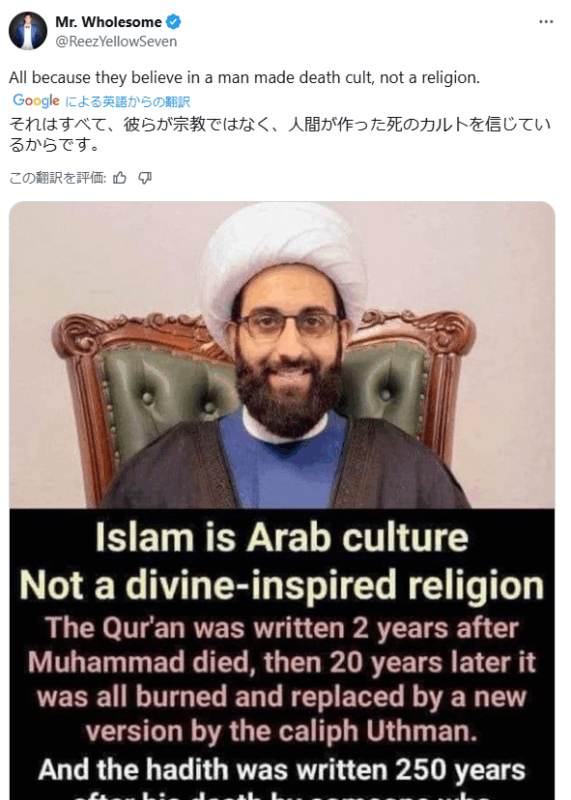 イスラム教はアラブ文化であり、神の啓示を受けた宗教ではありません。コーランはムハンマドの死後2年で書かれましたが、20年後にすべて焼かれ、カリフのウスマーンによって新しい版に置き換えられました。