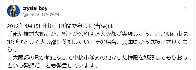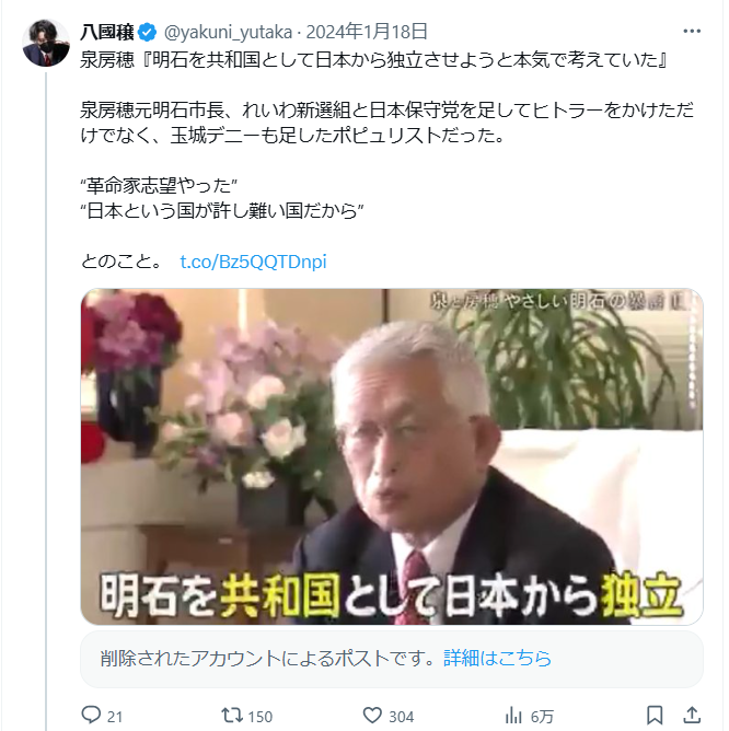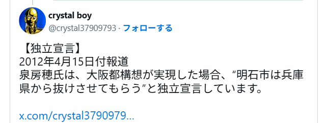 日本が大嫌いだと語る 泉房穂を是非ご覧下さい。泉さんは日本人なのですか?タイトルが切り取り編集ですが、ブログ内容を確認してください。 世界・日本の真実 2025.07.19 明石市民の方 騙されていたのですか?日本から独立するつもりだったのですか?日本という国が許しがたい!なんですって。へっ!?初めて聞きました。皆騙されたらだめですよ! 日本が大嫌いだと語る泉房穂を是非ご覧下さい。 pic.twitter.com/yR4Nz4VLjZ— 立花孝志!【悪い奴らを許さない!】参議院選挙に立候補中【兵庫県】 NHK党 党首 (@tachibanat) July 19, 2025
