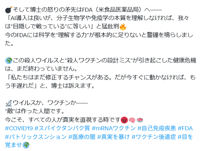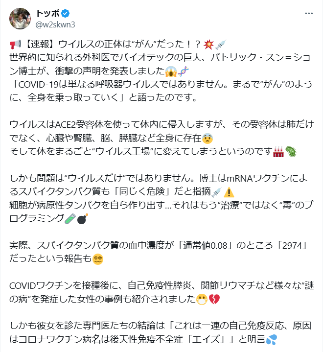 速報 ウイルスの正体は“ガン”だった!? 世界・日本の真実 2025.07.22 「COVID-19は単なる呼吸器ウイルスではありません。まるで“がん”のように、全身を乗っ取っていく」と語ったのです。この殺人ウイルスと“殺人ワクチンの設計ミス”が引き起こした健康危機は、まだ終わっていません。「私たちはまだ修正するチャンスがある。だが今すぐに動かなければ、もう手遅れだ」