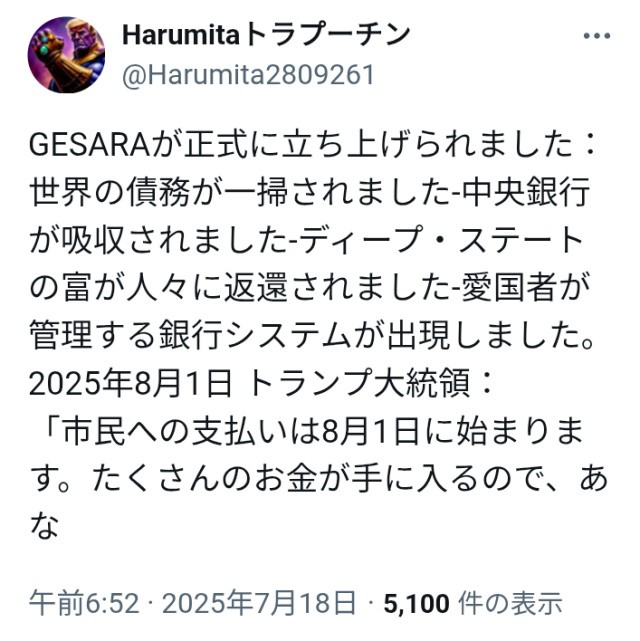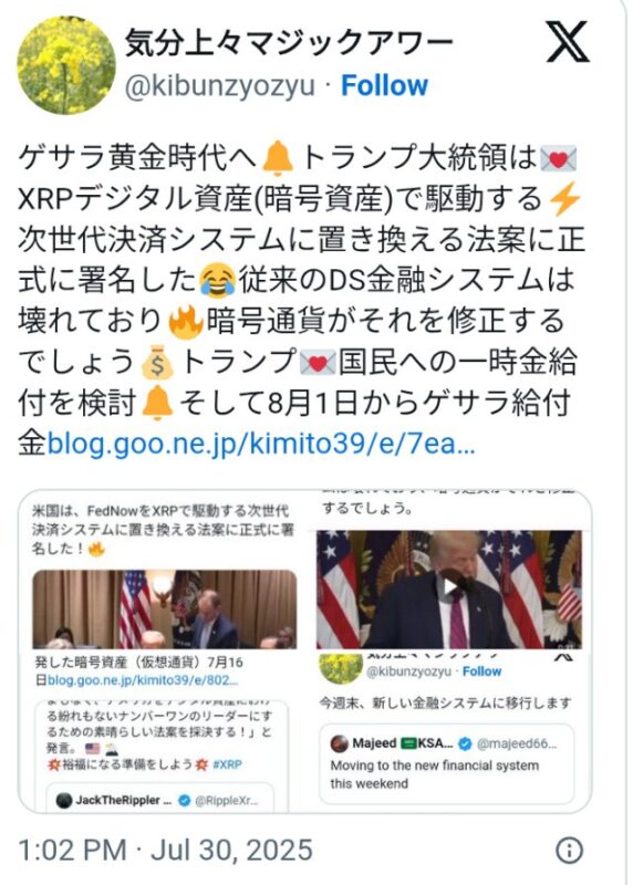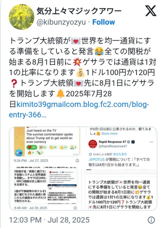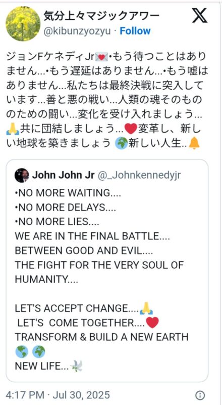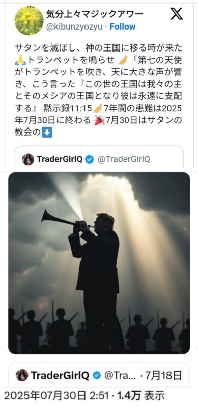 サタンを滅ぼし神の王国に移る時が来た。黄金時代です!今度こそ本当です。確信をもって8月1日からスタートです。シンプソンズ予言 世界・日本の真実 2025.07.30 待っていました。”皆が知るべき情報”ですが、引っ越しされました。新しいリンク先をクリックしてください。いよいよですね。少しだけ抜粋しましたが、下記のブルーの文字リンクをクリックすると本文に移動できます。 サタンを滅ぼし神の王国に移る時が来た🔔7年間の患難は2025年7月30日に終わる🎉黄金時代🔔トランペットを鳴らせ 🎺「第七の天使が(トランプ大統領)トランペットを吹き、天に大きな声が響き、こう言った『この世の王国は我々の主とそのメシアの王国となり彼は永遠に支配する』https://t.co/1nSTLFeLKJ pic.twitter.com/guBIBlKcFW— 気分上々マジックアワー (@kibunzyozyu) July 30, 2025 サタンを滅ぼし神の王国に移る時が来た🔔7年間の患難は2025年7月30日に終わる🎉黄金時代🔔トランペットを鳴らせ 🎺「第七の天使が(トランプ大統領)トランペットを吹き、天に大きな声が響き、こう言った『この世の王国は我々の主とそのメシアの王国となり彼は永遠に支配する』 黙示録11:15🎺7月30日はサタンの教会の7️⃣1️⃣1️⃣ヶ月記念日。聖書から711冊が欠けている。2001年9月11日から2️⃣3️⃣年🔟ヶ月1️⃣9️⃣日後🎯黄金時代 🔔2025年7月30日 | みんなが知るべき情報日々物語fc2反戦、反核。健康情報。日本が善き国になりますように