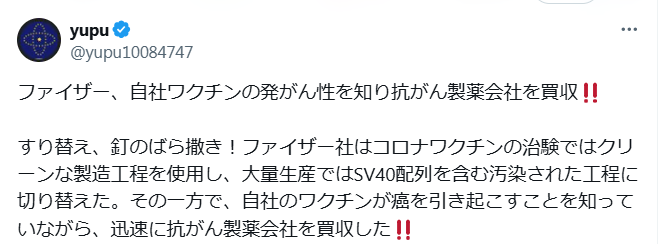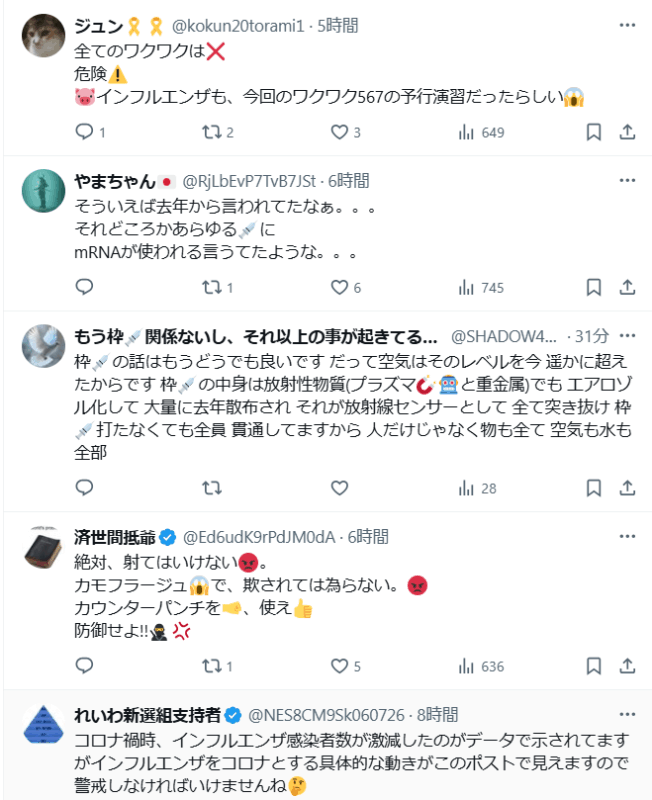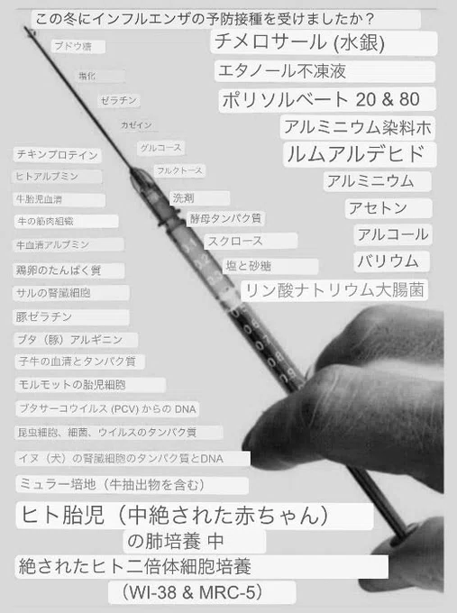 今年のインフルエンザワクチン、コロナワクで被害甚大となったmRNA技術を使う可能性!打ってはダメ! 世界・日本の真実 2025.08.02 インフルエンザワクチンを打ってはいけません。すべてのワクチンはまず止めておきましょう。生まれてすぐの赤ちゃんにまでワクチンを打っていたなんて知りませんでした。早く気づいてワクチン反対です。 とんでもない話がきた!今年のインフルエンザワクチン、コロナワクで被害甚大となったmRNA技術を使う可能性!村上康文教授(東京理科大)「半年どころか約2年間経ってもmRNAが発現しているケースもある」「今までのワクチン開発の分野ではIgG4を誘導したワクチンは失敗作」pic.twitter.com/xMR28RDnyD— JMAX (@JmaxTopics) August 2, 2025 ファイザー、自社ワクチンの発がん性を知り抗がん製薬会社を買収‼️… pic.twitter.com/thknK90A6A— yupu (@yupu10084747) August 2, 2025
