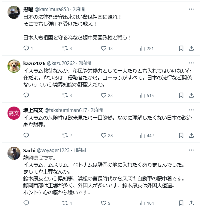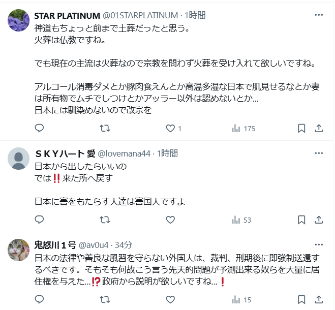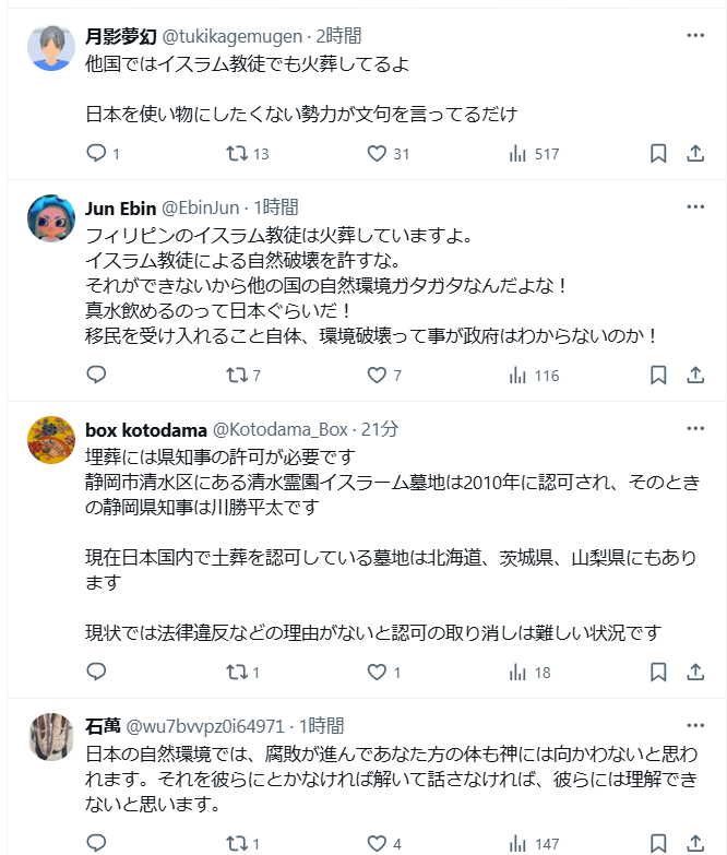止めて欲しいですね。感染予防のためにも早く中止してほしい。過激派イスラム教徒はお国に帰って欲しい。そこで土葬すればいいんですよ。犯罪にもつながりますよ。日本国を破壊させたいのか!