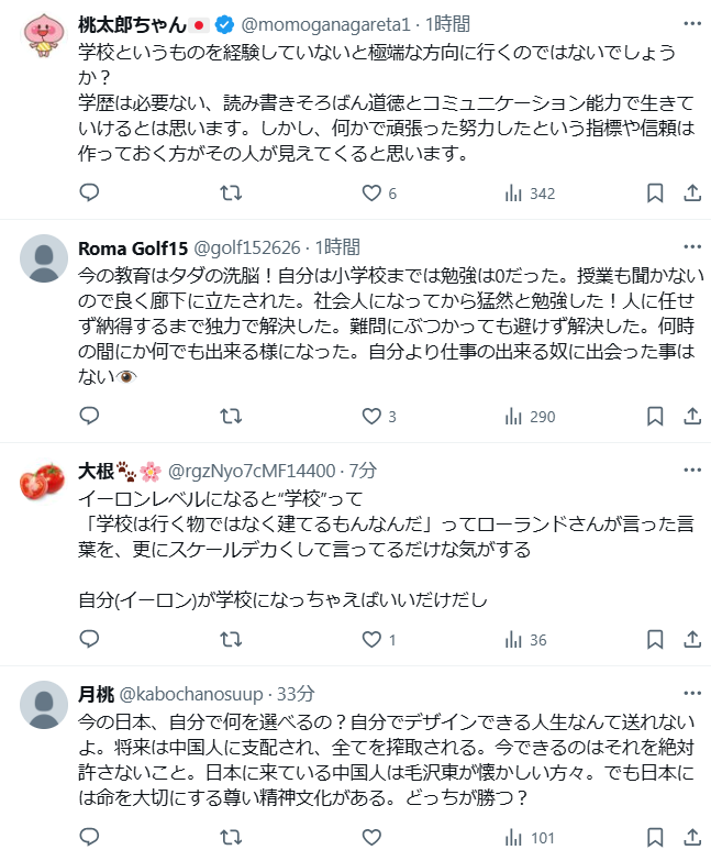イーロンマスクが“子供に勉強させない”深すぎる理由 たった一つの理由 世界・日本の真実 2025.08.10 これからの新地球ではこういう生き方、子ども教育が実践されていくのかな?私もこんな子育てをしたかった・・・ イーロンマスクが”子供に勉強させない”深すぎる理由pic.twitter.com/Kr7MzumA6p— ひで2022真実を追求 (@hide_Q_) August 10, 2025