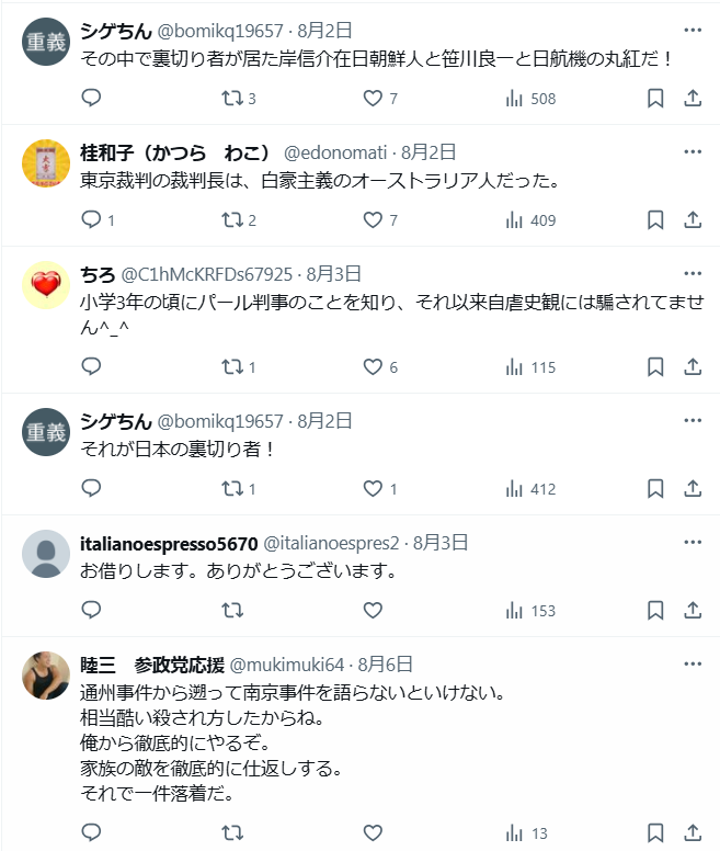学校ではあまり教わらない大東亜戦争、日本が戦った本当の理由 世界・日本の真実 2025.08.10 エリザベスさん 分かりやすく説明してくれています。私は調べれば調べるほど腹が立ってくるんです。 🚨これ見るとわかるよ。*東京裁判は明らかなリンチだ。アメリカがどうして日本を罰することができるのか私は理解できない。≪ウィロビーGHQ参謀部長≫*東京裁判は史上最悪の偽善だ。もし米国が同じ立場だったら日本と同じように戦っただろう≪HGウェルズSF作家≫⬇️https://t.co/kIKJVJamJe— でらまじ🇯🇵〈Super Seriously〉 (@yugC0dTxXy9g5co) August 9, 2025 東京裁判の実際の映像を見た時は西欧諸国の「正義」がいかに勝手なものかを思い知らされた…しかも同じ敗戦国であるドイツ🇩🇪と日本🇯🇵とでは全くと言っていいほど裁き方が違う… パール判事はこの裁判 を、こう述べている…『裁判の方向性が予め決められており… pic.twitter.com/ftdumzY2BJ— 🎌不動心🎌 ✨Neo✨ (@tenkataihei369) August 2, 2025 東京裁判の実際の映像を見た時は 西欧諸国の「正義」がいかに勝手な ものかを思い知らされた… しかも同じ敗戦国であるドイツと日本とでは全くと言っていい ほど裁き方が違う…パール判事はこの裁判 を、こう述べている… 『裁判の方向性が予め決められており 判決ありきの”茶番劇” である』 戦争・虐殺・搾取を続ける戦争屋達 と共謀する欧米諸国に他国を裁く 資格など全く無い