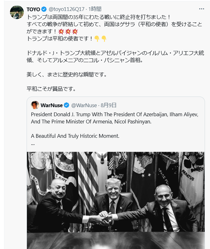 なんてこった! トランプがアルメニアとアゼルバイジャンの指導者に平和協定に署名させ、握手をさせて、35年にわたる紛争を終結させた。 なんて素晴らしい瞬間だ。トランプに今すぐノーベル平和賞を授与すべきだ。マスメディアでは一切報道せず。やはり私には難しい話題です。
