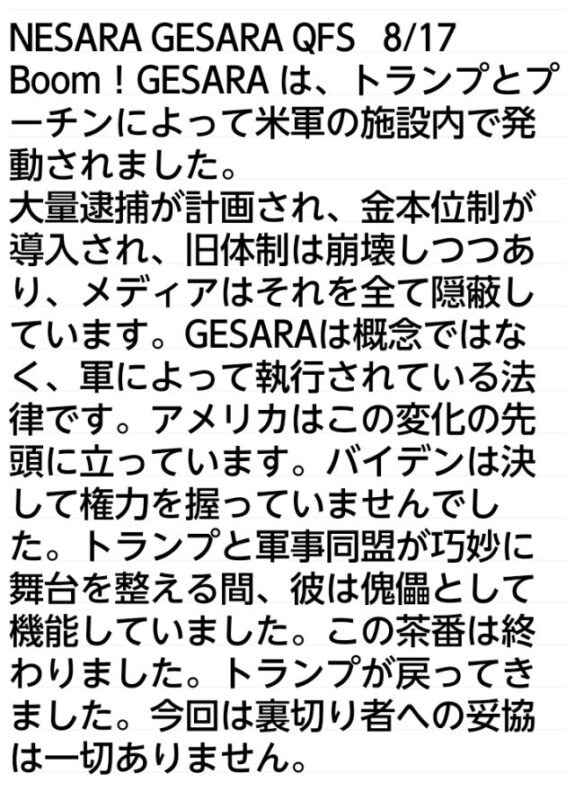 NESARA GESARA QFS 8/17/Boom!GESARA は、トランプとプーチンによって米軍の施設内で発動されました。大量逮捕が計画され、金本位制が導入され、旧体制は崩壊しつつあり、メディアはそれを全て隠蔽しています。
