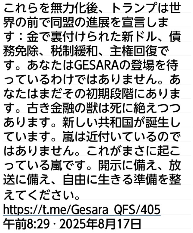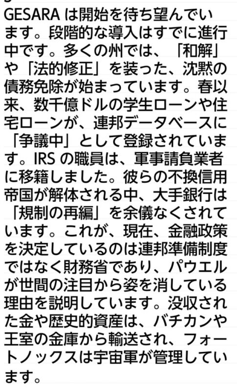 :金で裏付けられた新ドル、債務免除、税制緩和、主権回復です。あなたはGESARAの登場を待っているわけではありません。あなたはまだその初期段階にあります。古き金融の獣は死に絶えつつあります。新しい共和国が誕生しています。嵐は近付いているのではありません。これがまさに起こっている嵐です。開示に備え、放送に備え、自由に生きる準備を整えてください。