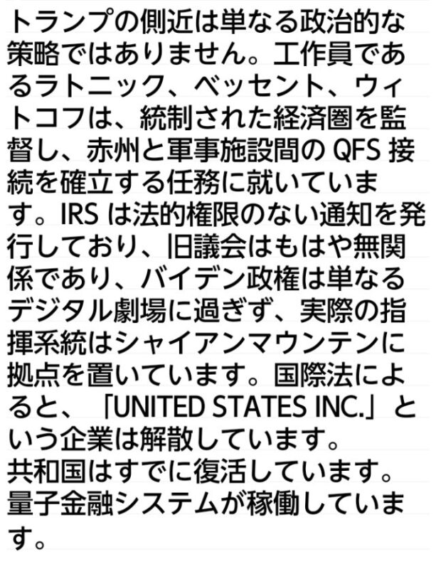トランプの側近は単なる政治的な策略ではありません。工作員であるラトニック、ベッセント、ウィトコフは、統制された経済圏を監督し、赤州と軍事施設間の QFS 接続を確立する任務に就いています。IRS は法的権限のない通知を発行しており、旧議会はもはや無関係であり、バイデン政権は単なるデジタル劇場に過ぎず、実際の指揮系統はシャイアンマウンテンに拠点を置いています。