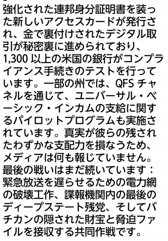 一部の州では、QFS チャネルを通じて、ユニバーサル・ベーシック・インカムの支給に関するパイロットプログラムも実施されています。真実が彼らの残されたわずかな支配力を損なうため、メディアは何も報じていません。最後の戦いはまだ続いています