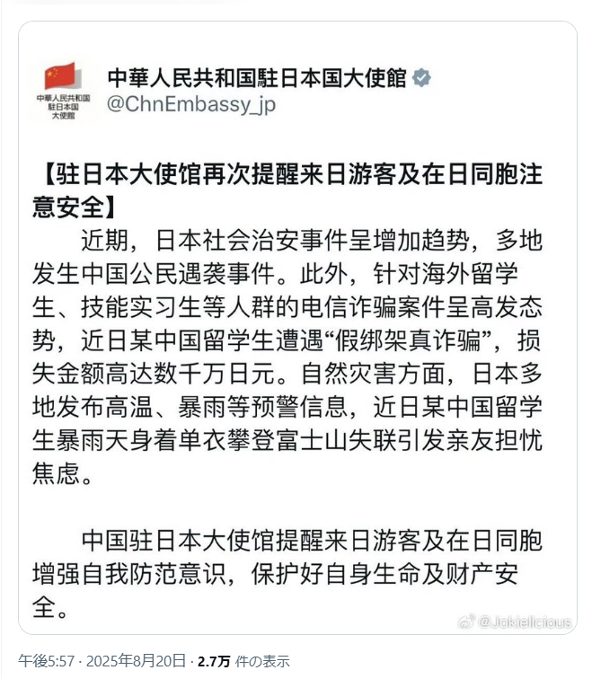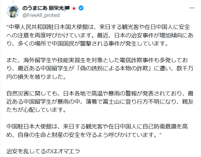 日本で中国人狩り始まる 中国人に中国大使館が注意喚起。
