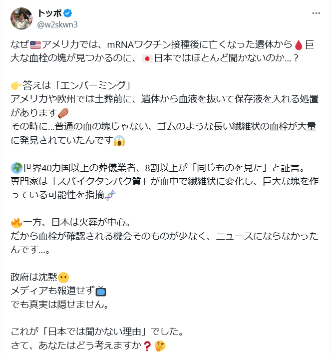 世界・日本の真実当初から日本国内でも繊維状の血栓が大量にあると訴えておられる方もいましたね。ファイザーと国との契約でワクチンの検査をしてはいけないとか闇契約をしていたので、調べることもできない状態だった。心臓が溶けるとか、葬儀屋さんが言われるにはご遺体の体温が37℃もあるとか暴露されていましたが、SNS上でも消されていました。