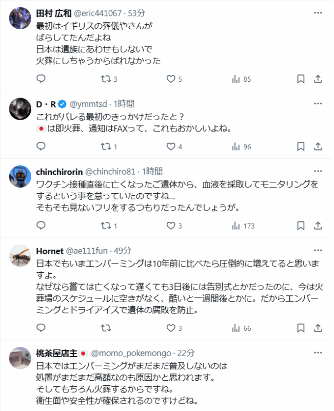 当初から日本国内でも繊維状の血栓が大量にあると訴えておられる方もいましたね。ファイザーと国との契約でワクチンの検査をしてはいけないとか闇契約をしていたので、調べることもできない状態だった。心臓が溶けるとか、葬儀屋さんが言われるにはご遺体の体温が37℃もあるとか暴露されていましたが、SNS上でも消されていました。