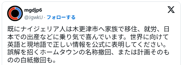 海外から笑われていますよ。アフリカに日本を捧げます。何故アフリカでも一番治安の悪いナイジェリアに門戸を広げるのか?それも千葉県と木更津市との間で見解の違い!JAICAが間に入っている。JAICAと言えばUSAIDからお金をもらっている団体だった。もうこんな闇のシナリオに日本国民は都道府県関係なく吠えないとあかん!
