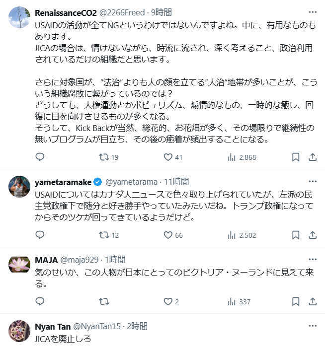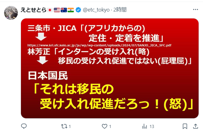 USAIDの日本版がJICAだった!いい加減日本人を騙すのは止めろ!DSの悪だくみ とことん暴露しましょう。他にもありますね 世界・日本の真実 2025.08.27 アフリカホームタウン構想で市民、国民が気づかなきゃだめですよ。もう3年も前からの計画だったようですね。JAICAの仕事だと言って忙しく働いている人もいたが、その方は本当の悪だくみについては知らなかったのですね。 汚職の温床として、実質活動停止したUSAID。 その🇯🇵版とも言えるのがJICA。「JICA USA」によれば、2024年9月にJICAの田中理事長はUSAIDのトップと面会し、人道支援、民主主義などのテーマで、グローバルな協力について話し合った。JICAの職員は、定期的にUSAIDに出向。 pic.twitter.com/y53P7sZ3mM— FBO _BS (@bs_fbo) August 26, 2025 アフリカホームタウン構想で誤情報?はぁ?火消し💦に見えますが? pic.twitter.com/MG0ztS6VaE— 町田くん (@machida19650218) August 27, 2025 ウソをついていたのは海外メディアやナイジェリア政府ではなく、やはりJICAと外務省でした。私は最初からそう思っていました。日本のエリートはほぼ例外なくウソつきで、良心の呵責など全くないからです。コロナ禍での日本の医師や学者の振る舞いを見れば、よく分かるでしょう。 https://t.co/40iVlPSoY1— Hideki Kakeya, Dr.Eng. (@hkakeya) August 26, 2025