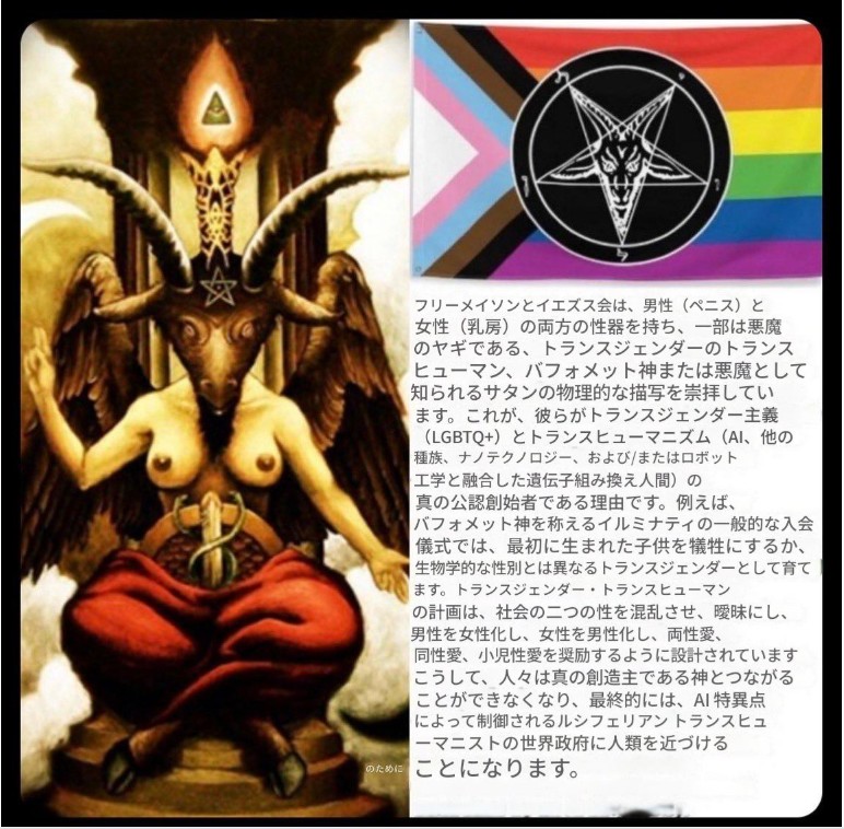 例えば、バフォメット神を称えるイルミナティの一般的な入会儀式では、最初に生まれた子供を犠牲にするか、生物学的な性別とは異なるトランスジェンダーとして育てます。トランスジェンダー・トランスヒューマンの計画は、社会の二つの性を混乱させ、曖昧にし、男性を女性化し、女性を男性化し、両性愛、同性愛、小児性愛を奨励するように設計されていますこうして、人々は真の創造主である神とつながることができなくなり、最終的には、AI 特異点によって制御されるルシフェリアン トランスヒューマニストの世界政府に人類を近づけることになります。