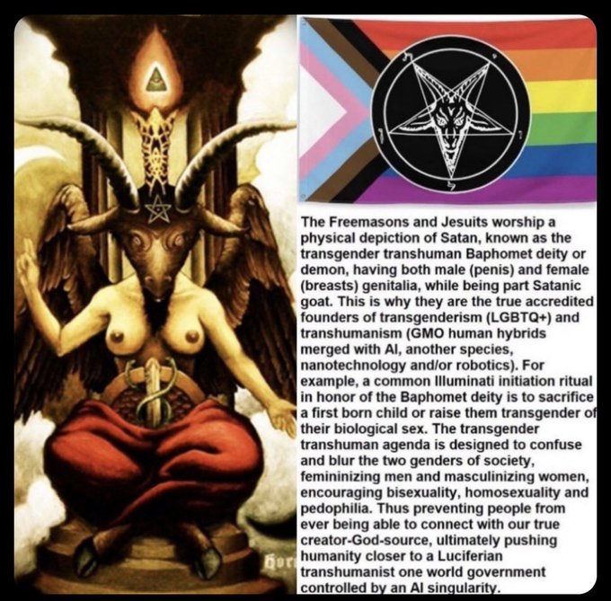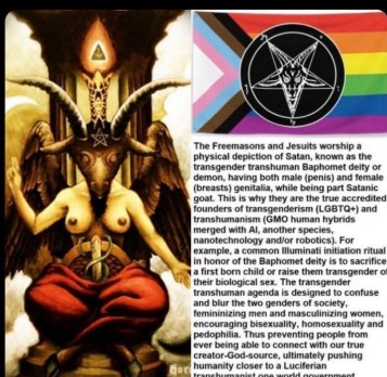 フリーメイソンとイエズス会は、男性(ペニス)と女性(乳房)の両方の性器を持ち、一部は悪魔のヤギである、トランスジェンダーのトランスヒューマン、バフォメット神または悪魔として知られるサタンの物理的な描写を崇拝しています。