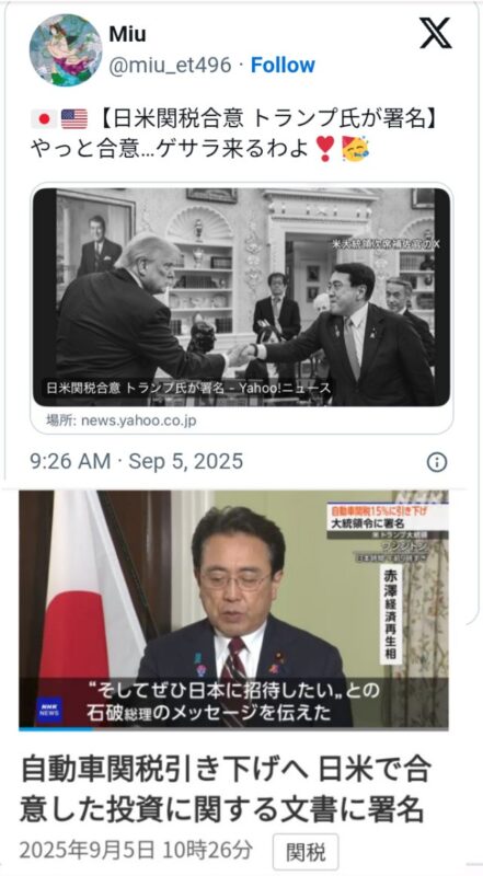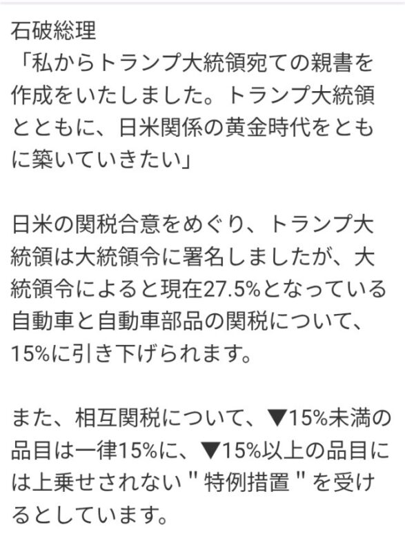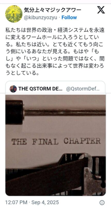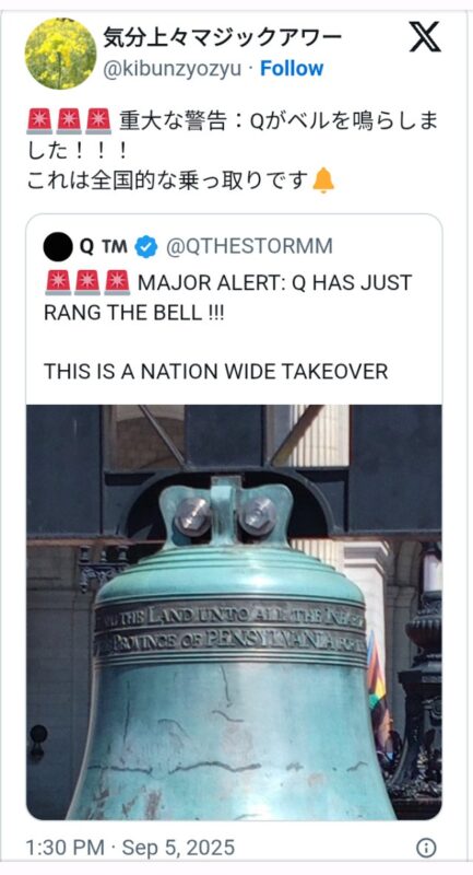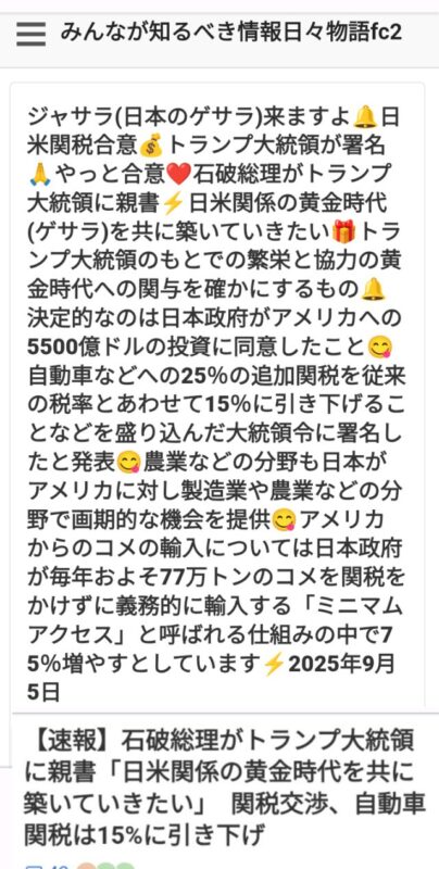 Qがベルを鳴らしました JASARA(日本のGESARA)がやってきます。 世界・日本の真実 2025.09.05 トランプ大統領が署名 石破総理がトランプ大統領に親書 日米関係の黄金時代(ゲサラ)を共に築いていきたい トランプ大統領のもとでの繁栄と協力の黄金時代への関与を確かにするもの 2025年9月5日 重大な警告💥Qがベルを鳴らしました🔔これは全国的な乗っ取りです😋世界的ディープステイトの終焉でしょう😋故に🎁ジャサラ(日本のゲサラ)来ますよ🔔日米関税合意💰トランプ大統領が署名🙏石破総理がトランプ大統領に親書⚡日米関係の黄金時代(ゲサラ)を共に築いていきたい🎁⬇https://t.co/4YZOMvKRUW pic.twitter.com/AoOz5dspPR— 気分上々マジックアワー (@kibunzyozyu) September 5, 2025 重大な警告💥Qがベルを鳴らしました🔔これは全国的な乗っ取りです😋世界的ディープステイトの終焉でしょう😋故に🎁ジャサラ(日本のゲサラ)来ますよ🔔日米関税合意💰トランプ大統領が署名🙏石破総理がトランプ大統領に親書⚡日米関係の黄金時代(ゲサラ)を共に築いていきたい🎁トランプ大統領のもとでの繁栄と協力の黄金時代への関与を確かにするもの🔔2025年9月5日 | みんなが知るべき情報日々物語fc2ゲサラ黄金時代。トランプさんが2016年大統領になる前からトランプ大統領支持者。そしてプーチン大統領の支持者です。
