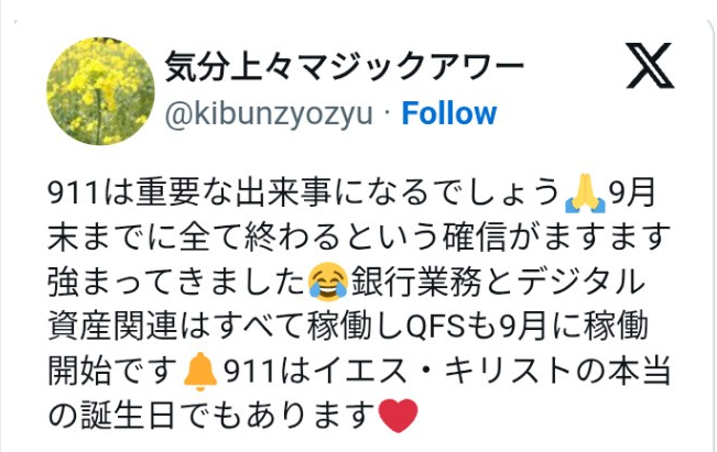 9.11に全世界的GESARA RVに注目 イラク危機 グローバル・リセットのカウントダウンの開始 エチオピア暦の元旦でもある 世界・日本の真実 2025.09.08 9.11はキリストの誕生日だし、エチオピアはシバの女王がソロモンと会って帰った国ですね。ソロモンとの間に子どもがいたんですよ。なんだかすごい展開になってきました。 9月11日に全世界的ゲサラRVに注目💌イラク危機⚡債券、RV、そしてグローバル・リセットのカウントダウン開始🇮🇶大きな動きまであと3~4日💥RVはやはり11日なのか⚡チャーリー・ウォードさんもRVは9月11日と言ってた😏エチオピア暦の元旦でもある😙2025年9月8日https://t.co/0JkkFYgAk5みんなが知るべき pic.twitter.com/rfYEU8fRBX— 気分上々マジックアワー (@kibunzyozyu) September 8, 2025 続きはみんなが知るべき情報日々物語fc2をご覧ください。↓ 2000年ぶりに世界中で最終的なタイムラインがリンクされました🥰画像は江戸城に妖しい月(皆既月食ブラッドムーン)🌕黄金時代への画像❓ラストジャパン🔔9月7日…ブラッドムーンを忘れないで💌闇から光へ⚡富の移転を支援する🔔終わりは始まり🥰すべてのブロックチェーンが崩壊寸前⚡ = すべてStellarに転送されます⚡反転、切り替え⚡間近です😋Pendulum/Spacewalkは株式市場やその他のブロックチェーンからすべての資金をStellarに取り込む米国宇宙軍のツールです😂2025年9月8日 | みんなが知るべき情報日々物語fc2ゲサラ黄金時代。トランプさんが2016年大統領になる前からトランプ大統領支持者。そしてプーチン大統領の支持者です。