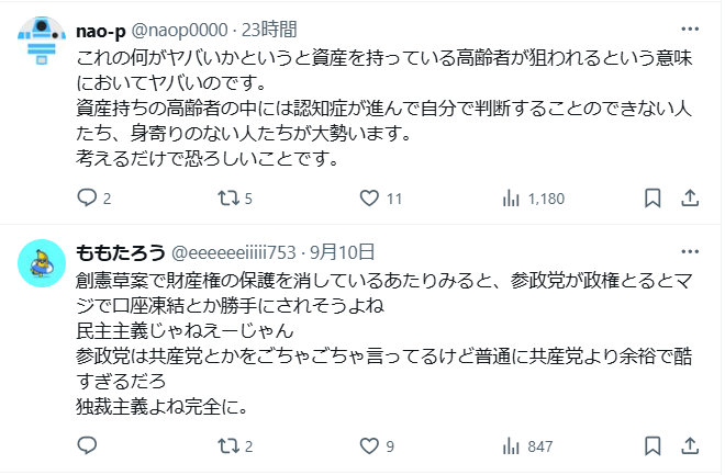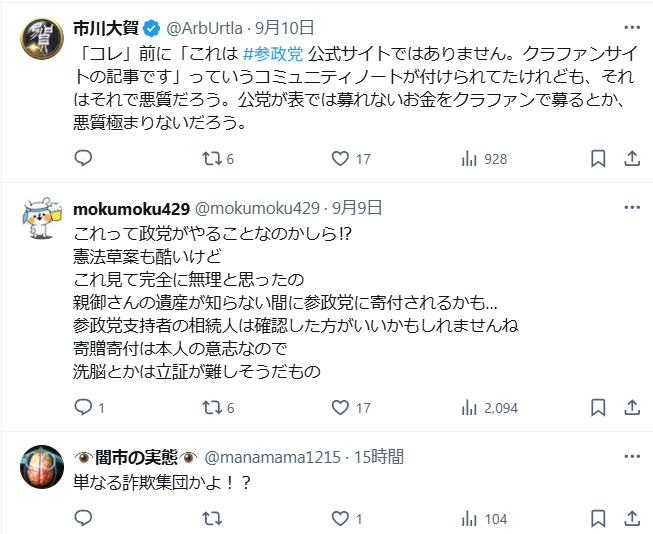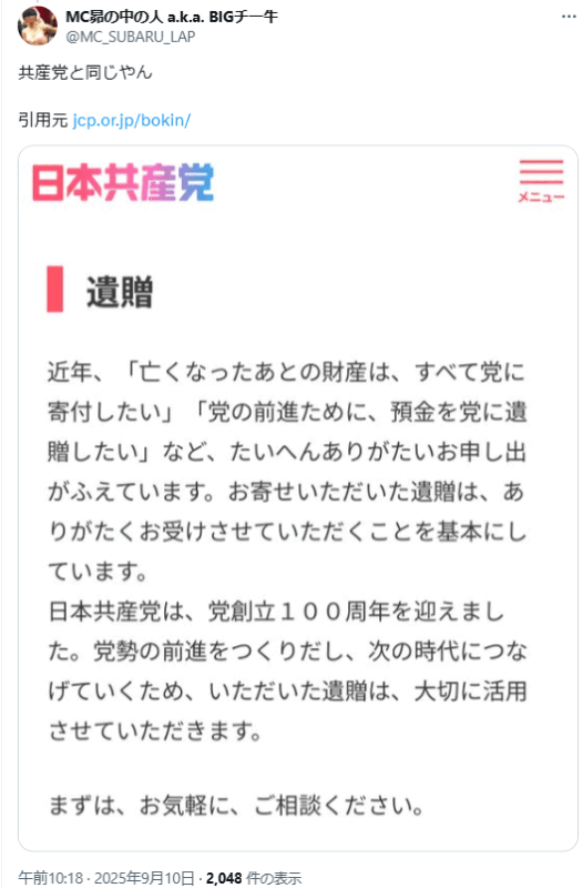 参政党 遺贈、相続財産のご寄付に関して これって本当ですか? 世界・日本の真実 2025.09.11 本当ですか?まるで統一教会並みのシステム構築では?神谷さんがかつてクラウドファンディングで資金を集めていることは情報でありましたね。裏ではこのようなこともしていたんだ… 参政党のこれ、やばすぎて。 https://t.co/CuCOyiRu64 pic.twitter.com/KkyPrXmLqk— 世界・驚愕ニュース (@world_news2025) September 9, 2025 参政党北海道支部連合会「遺言書や相続人の遺産分割協議に基づいて、ご自身や亡くなった方の財産の全部または一部について、参政党を受取人として指定いただくことで、遺産を役立てていただくことができます」これを見て「狂っている」と思わない人間は狂っていると思う。https://t.co/lPJWlFT9HE— seal (@4RygOC0vJEwjTpl) September 9, 2025