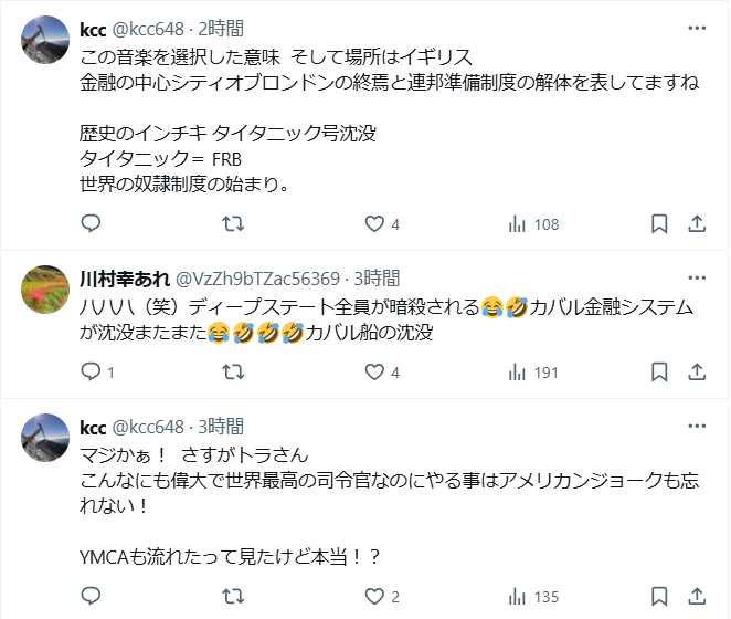 「タイタニック」の意味だが、連邦準備制度理事会とロスチャイルド中央銀行システムの設立に反対した最も有力な人物たちが全員、タイタニック号/オリンピック号に乗っていた。 カバールの金融システムが沈没する日が近づいているからだろうか?