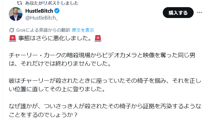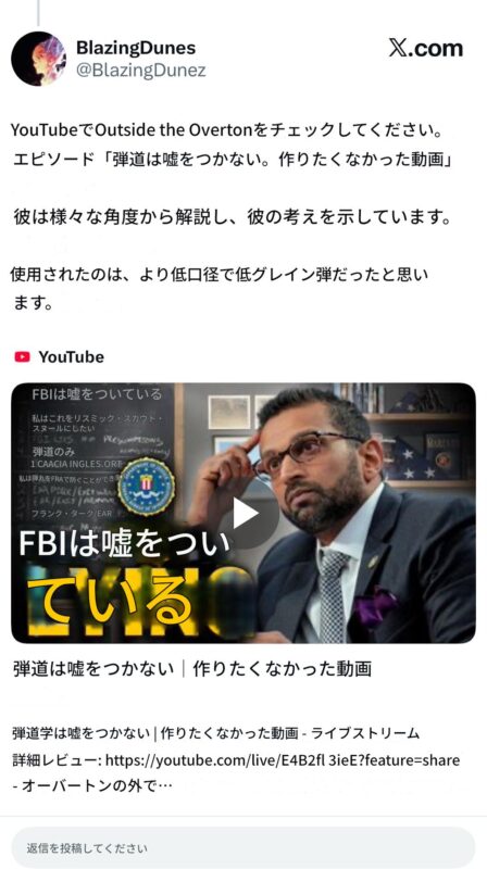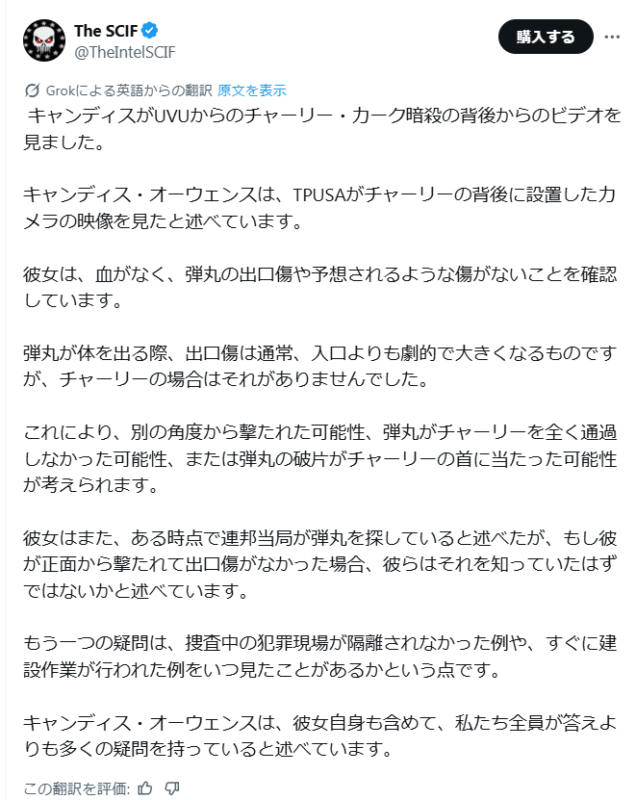 私が特に気になったのは、何度も何度も繰り返して映像を見せるように頼んだのですが、血痕がないことです。背中に血痕はありません。血痕はありません。だから、多くの人が銃弾が銃口を貫通して背後から出たのかどうか疑問に思っていると思います。私は漠然と覚えていますが、銃弾は散乱していました。これで納得できるかもしれません。例えば、連邦捜査官が銃弾を探していると言っていたような気がしますが、今となっては非常に憂慮すべき事態です。私には理解できません。どうして銃弾を探していたのか?なぜなら、もし私が見ていないし、銃弾も見ていないのなら、前方で起こっていることと後方で起こっていることは全く違うからです。血痕も見えません。どういうことですか?そこから何を読み取るべきでしょうか?彼らの言っていることが真実で、その人物が彼らが言っている場所から発砲したとすれば、唯一納得のいくことです。それは、チャーリーの体内にあったことを示唆しているのではないでしょうか?そして、彼らは連邦捜査官がそれを知っていたことを知っているはずです。ですから、彼らは銃弾を探していたわけではないと伝えたはずです。なぜなら、一発の銃弾だったことを覚えているからです。私はとても混乱しています。私が見たものだけでなく、私が見なかったものについても、とても混乱しています。