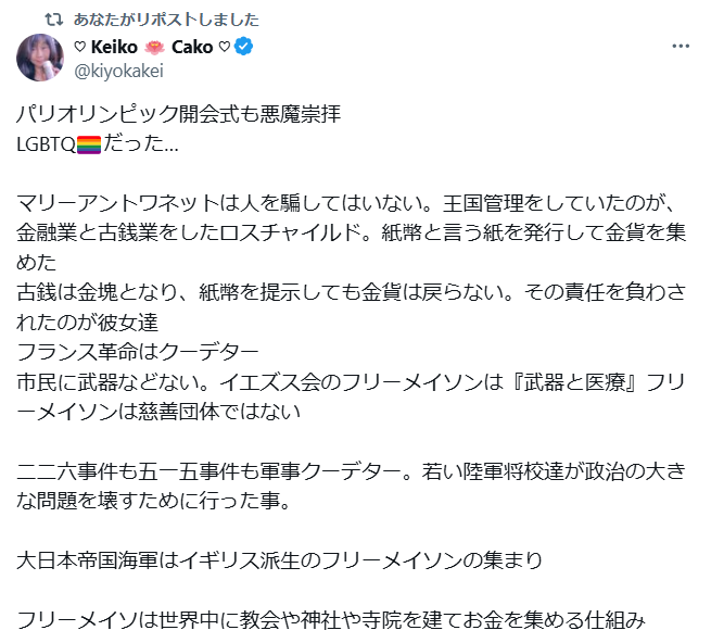 マリーアントワネットは人を騙してはいない。王国管理をしていたのが、金融業と古銭業をしたロスチャイルド。紙幣と言う紙を発行して金貨を集めた 古銭は金塊となり、紙幣を提示しても金貨は戻らない。その責任を負わされたのが彼女達 フランス革命はクーデター 市民に武器などない。イエズス会のフリーメイソンは『武器と医療』フリーメイソンは慈善団体ではない 二二六事件も五一五事件も軍事クーデター。若い陸軍将校達が政治の大きな問題を壊すために行った事。 大日本帝国海軍はイギリス派生のフリーメイソンの集まり フリーメイソは世界中に教会や神社や寺院を建てお金を集める仕組み