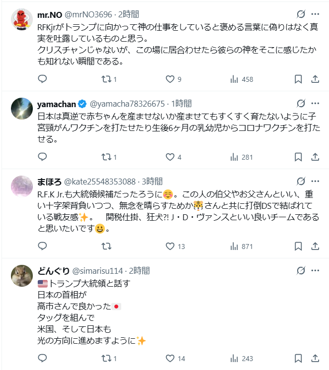 RFKジュニアは感謝しているのでしょうね。日本は一体何してるんですか?腹の立つニュースばかり流れています。SNS上でも真偽が分からない情報ばかりです。どれを信じたらいいのでしょうか?