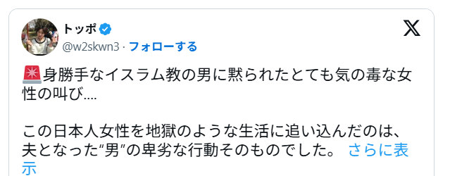 この女性の証言から浮かび上がるのは、イスラム教の男による徹底した支配と搾取。 彼は妻を、愛する伴侶ではなく“使い捨ての道具”として扱い続けていたのです