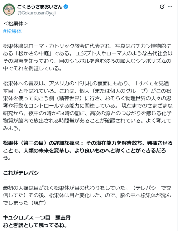 松果腺が産生するメラトニンというホルモンは、不眠やうつ病を引き起こす欠乏症の原因となり、オーツ麦、トウモロコシ、トマト、ジャガイモ、ナッツ、米、チェリーなどの食品に含まれています。シュメールやバビロニアの古代神殿では、松果腺への崇拝があり、バチカンでも巨大な松かさの形をしたモニュメントが見られます。