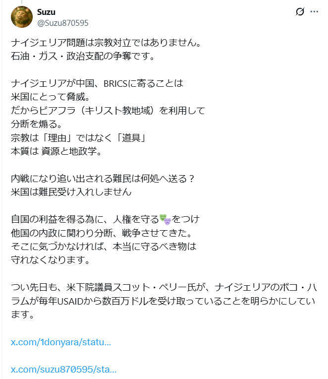 「世界中でキリスト教徒が殺されているのを、アメリカはもう黙って見ていない」 とくに名指しされたのはナイジェリア。