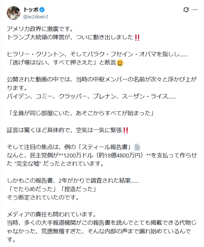 「スティール報告書」 なんと、民主党側が**1200万ドル(約18億4800万円)**を支払って作らせた “完全な嘘” だったとされています。2020年選挙も不正だったことをクリスマスにばらした。