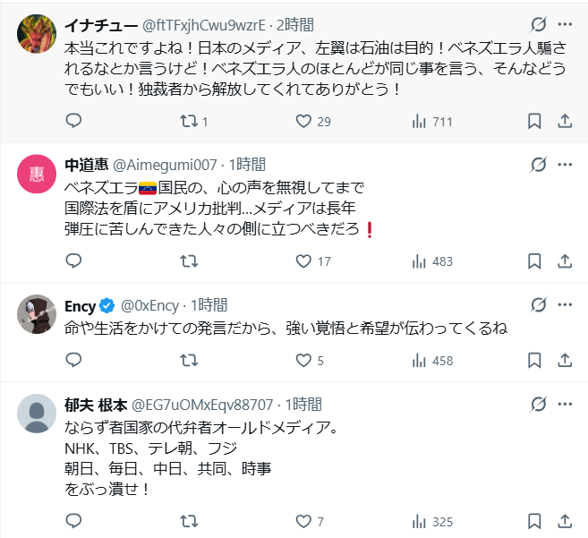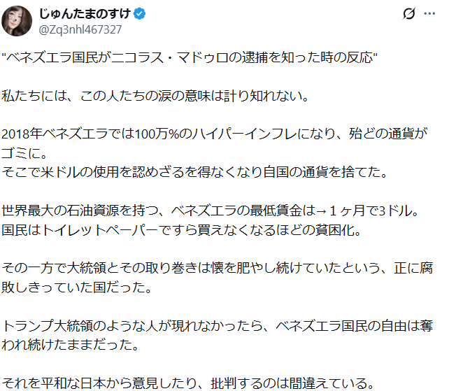 1/11更新:”ベネズエラ国民がニコラス・マドゥロの逮捕を知った時の反応” 日本人がほとんど知らない現実 世界・日本の真実 2026.01.072026.01.11 メディアでは全く頓珍漢なことばかり報道しています。立派な学者さんやジャーナリストの人たちも何故本当のことを伝えないのか?不思議でたまりません。まあ私みたいに知った情報を手当たり次第に載せているブログとは違いますね。責任を問われますから。 🇻🇪ベネズエラについて『日本人が知らない現実』ジャーナリスト山上信吾氏 pic.twitter.com/d9OPht689T— ケンイチ (@ak0701QMAGA17) January 10, 2026 このベネズエラ人はベネズエラでの出来事を語り、こう言った。『ベネズエラ攻撃は国際法違反だと言う彼らは、共産主義者だ!』その通り。オウム真理教施設を強制捜査した警察を、宗教弾圧だと言った輩と同じなのだ。小野寺五典!お前の事だ。 pic.twitter.com/zhRlIsODze— 髙安カミユ(ミジンコまさ) (@martytaka777) January 6, 2026 🇺🇸フロリダ在住のベネズエラ亡命女性の心揺さぶる言葉😭「トランプが自由を与えるために石油が必要なら、喜んで全て差し上げます!石油は私たちに恩恵なんて一度ももたらさなかった。中国やロシアも石油目当て。でもトランプ大統領だけが行動してくれた。これで家族に会えるかも…🙏」 pic.twitter.com/3lFHbeIuWe— とうしろう(5号)守若 冬史郎🙄 (@tourouken555) January 6, 2026