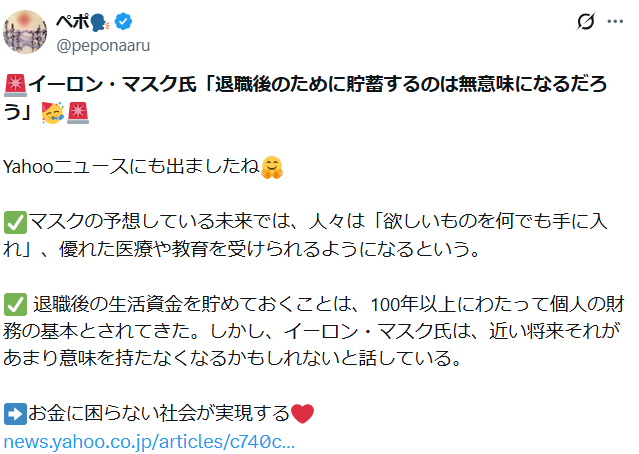 イーロン・マスクが『退職後の為に貯蓄するのは無意味になるだろう』と語った 貯蓄は無意味に!?今までの常識がぶっ壊れる!しかし移行する過程は『いばらの道』