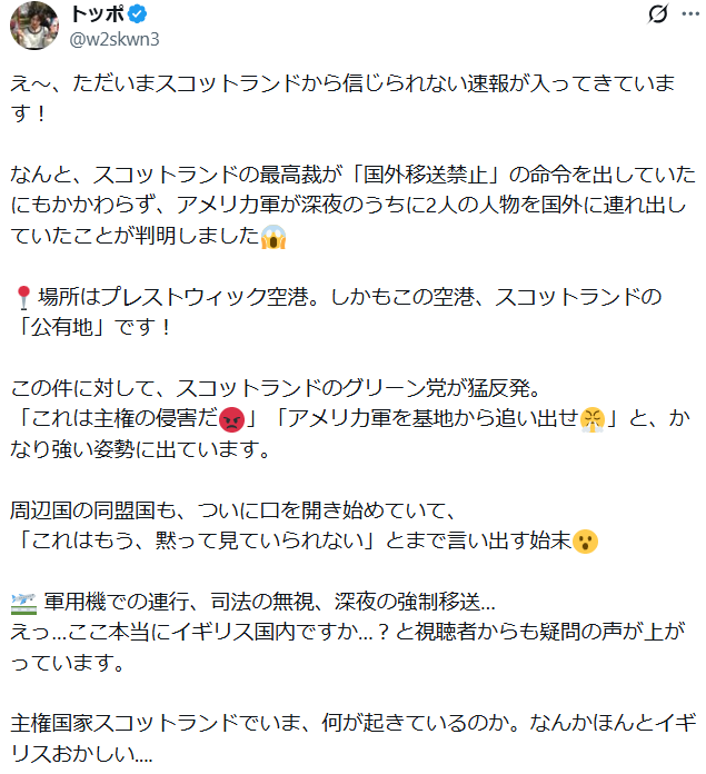 スコットランドの最高裁が「国外移送禁止」の命令を出していたにもかかわらず、アメリカ軍が深夜のうちに2人の人物を国外に連れ出していたことが判明しました