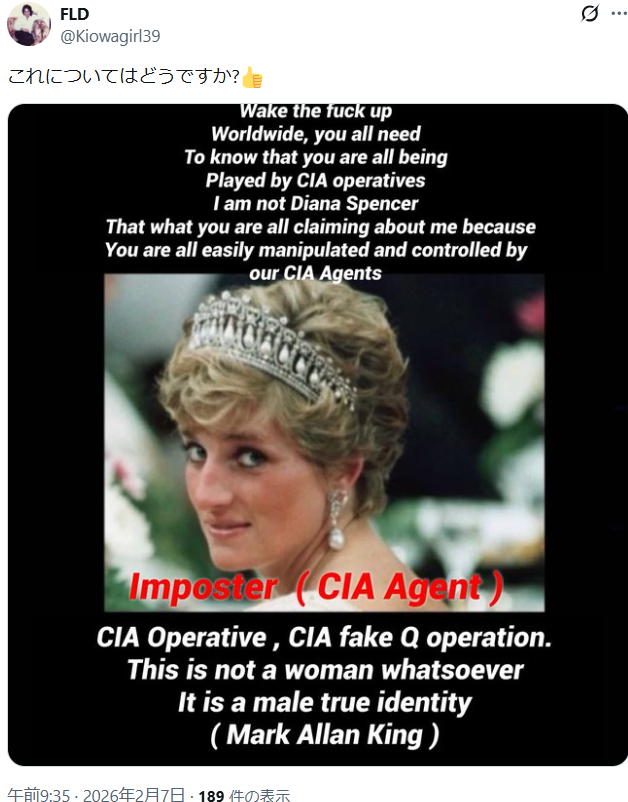愛しい妻であり姉である人へ!真実の準備はできていますか?★ダイアナ女王陛下の命令により 英国国王チャールズ三世を処刑 以降、ゴム俳優と交代する ★フアン・カルロス6世の息子(Juan Carlos ) ダイアナ妃の息子? 世界・日本の真実 2026.02.07 謎解きですか?ええ・っと・・下の写真はどういう意味なのか分かりません。 My lovely wife and sister ❤️ Are you ready for the truth?Yes or no pic.twitter.com/kYuCxwq7Bm— JOHN & JOHN .F. KENNEDY 'Q' (@JnJQJfk) February 6, 2026 ダイアナさんと奥さん、そっくりではないですか? pic.twitter.com/Tq8w7ms0OF— ごくろうさまおいさん (@GokurousanOyaji) May 14, 2023 🇺🇸💥🇺🇸。考えさせられます!メラニア夫人はダイアナ妃の衣装によく似ています…🇺🇸💥🇺🇸。この暴露映画では、ダイアナ妃がマスクをかぶってメラニア夫人を演じていると何度も聞いています。真実が明かされたら、わかるでしょう。🇺🇸💥🇺🇸 pic.twitter.com/Bm0IhOjNg2— twins_papa2号 (@10092002r) June 16, 2025 トランプ大統領と話しする。背の高い男性はスペインの旧国王(前国王、退位した国王)フアン・カルロス6世の息子(Juan Carlos )ダイアナ妃の息子 pic.twitter.com/q19lePFmt6— 禅 (@N8DlDF7sWxu0uV8) January 1, 2026