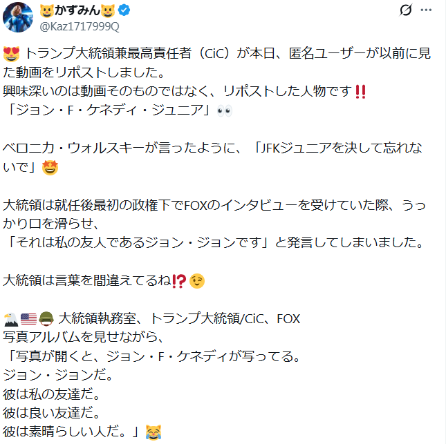 これから数時間のうちに💌JFKジュニア(ネサラ・ゲサラ真の主役)がEBS放送で姿を現す🔔生きており😋見守り⚡ケネディ家の遺産と🔔ディープステートのクーデターに関する真実を明らかにする準備ができている💥ケネディ大統領の息子が帰還する🇱🇷彼が口を開く時😋最初の言葉は何だろうか❓嵐は常に彼を影に潜ませていた⚡神は己の者を守る🙏John F. Kennedy Jr. 2/14⚡Julian Assange⚡2025年2月14日|みんなが知るべき情報fc2ブログ