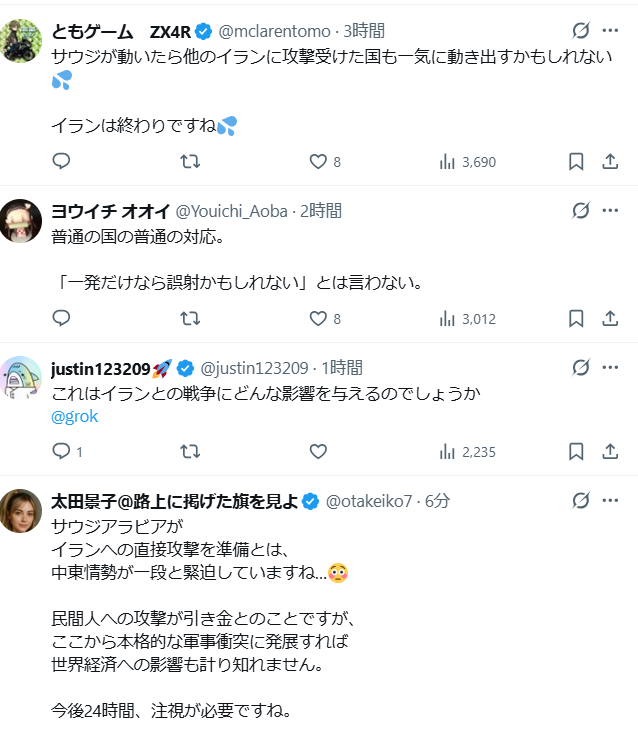 【速報】サウジアラビアは「一線が越えられた」ため、イランへの壊滅的な攻撃を承認する準備を進めている。 いよいよだ。 信頼できる情報筋が私に語ったところによると、サウジアラビアは、自国の民間人に対する前例のないミサイル・ドローン攻撃に直面した後、空軍にイラン国内の標的を攻撃させる寸前にある。 今後24時間は激しいものになるだろうと、私は聞いている。