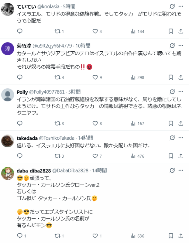 タッカー・カールソン氏が暴露した内容によると、カタールとサウジアラビアの当局が、爆破工作を計画していたモサドの工作員を現行犯で逮捕していたというんです。 しかも、その爆弾テロの目的がイランへの”なすりつけ”だったとされています