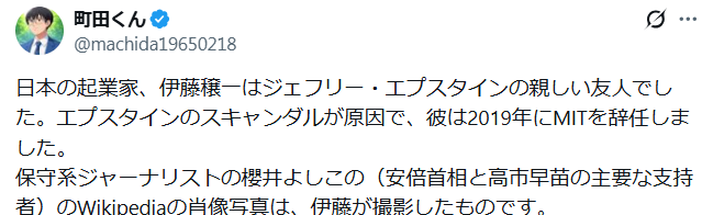 数年前に、エプスタインとの繋がりが取り沙汰されMITメディアラボを退任してはいるが、今回再び伊藤穣一の名前が浮上してきた🧐 pic.twitter.com/xcFZuIKizb