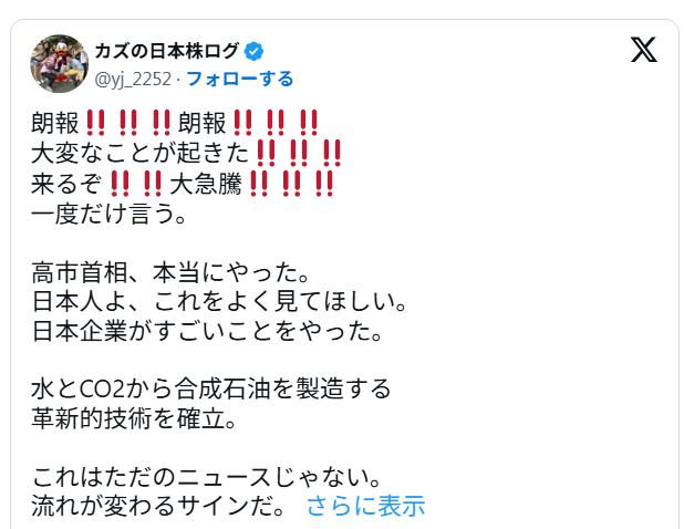 日本が世界を救う!【人工石油】水と二酸化炭素でつくる 単価は1リッター10円! 世界・日本の真実 2026.03.28 とにかく日本がすごいんです。日本が世界に頼られる理由 これからどうなるのか楽しみですね。 テレビが報じない外交の裏側、日本が世界に頼られる理由とは pic.twitter.com/HOoIuwFeJe— 358ちゃん (@max358japan) March 28, 2026 プーチン大統領🥰🥰🇯🇵🙏🙏🙏🙏🙏 pic.twitter.com/iWI1kkdZFp— 花幸🌸 (@GyTOGf3RTanlp98) March 27, 2026 ↑これはAIで造られたものかも・・・ 【人工石油】単価は1リッター10円!これで世界を救っちゃえ✨ pic.twitter.com/hRnxXHNRKy— 358ちゃん (@max358japan) March 26, 2026